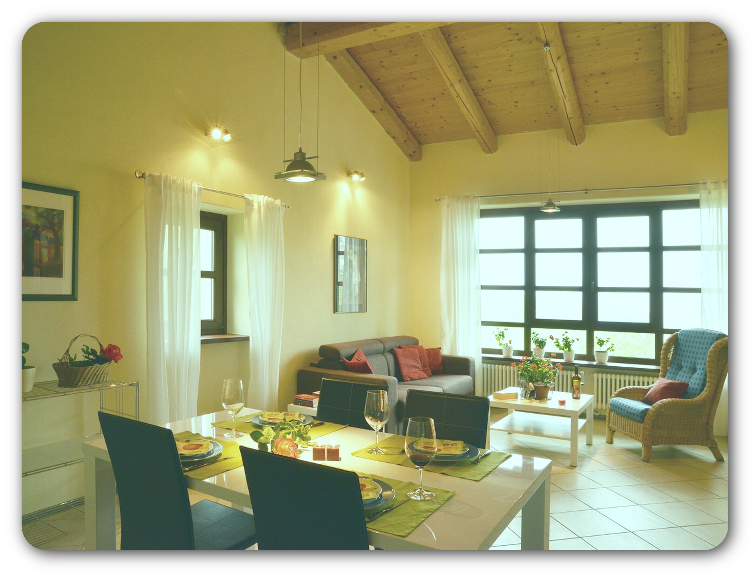 The large living room with open kitchen, with dining table for 4 persons, is furnished modernly and comfortably.